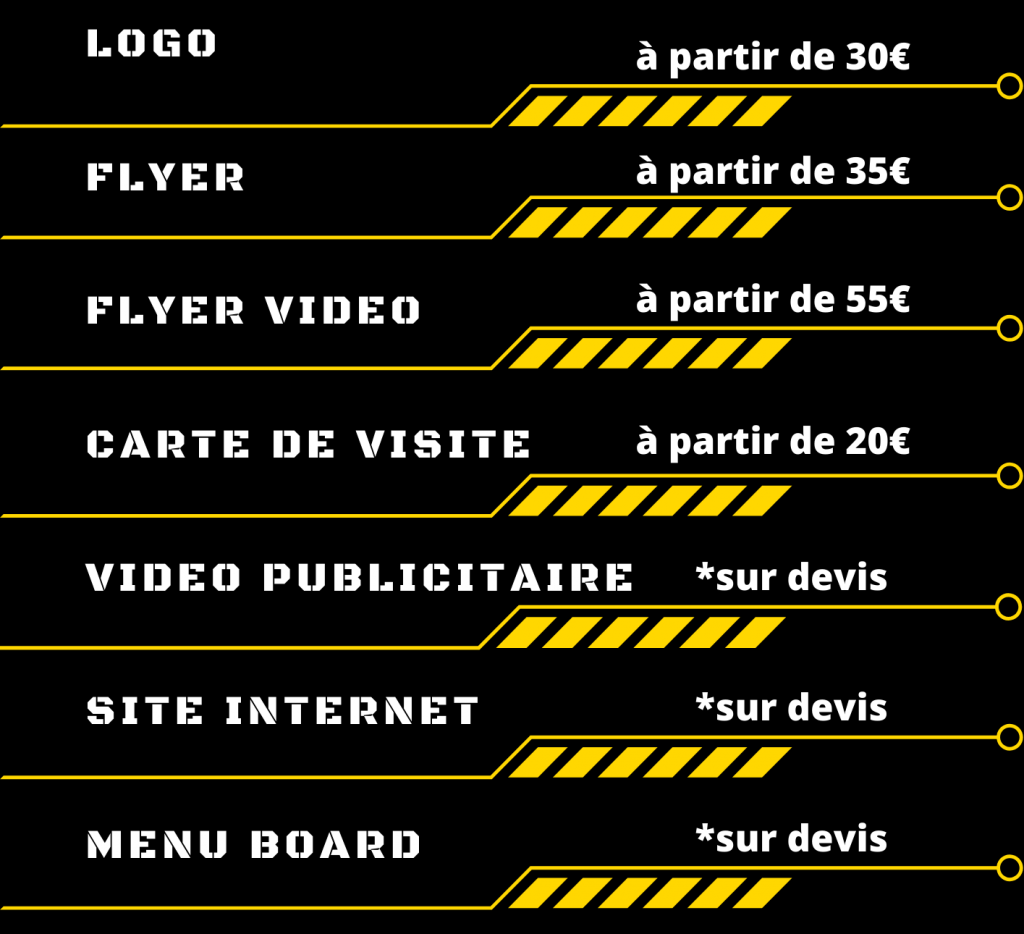 Nous offrons des services de création de flyers, vidéos de flyers, menu board, cartes de fidélité, cartes de visite, logos et vidéos publicitaires pour les entreprises de tous les secteurs.